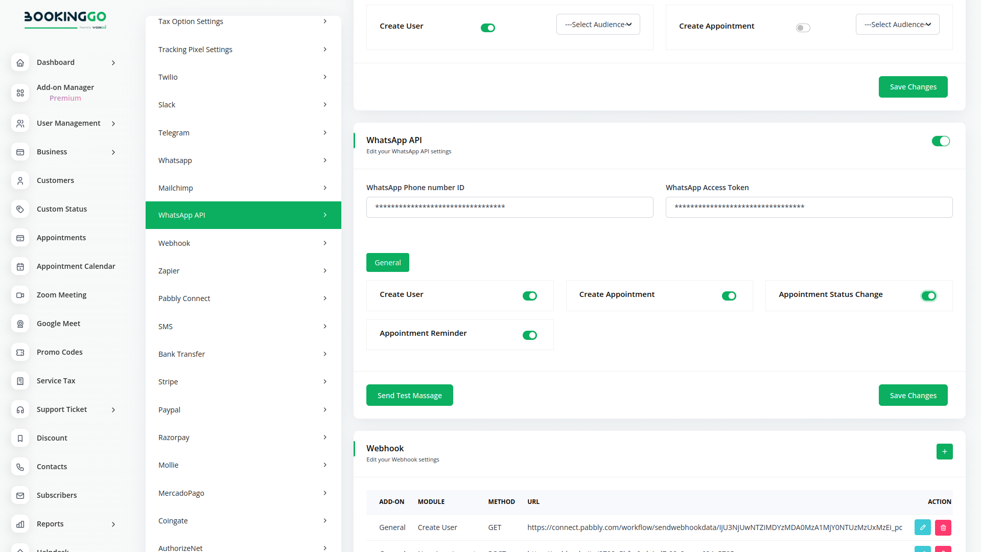 Enhance your BookingGo experience with our customizable WhatsApp event notifications feature. Tailor your alerts by toggling events on and off, empowering users to stay connected and informed through seamless WhatsApp integration. Easily configure credentials for the WhatsApp API and manage event preferences within the settings section, ensuring a personalized and efficient communication workflow within your application.